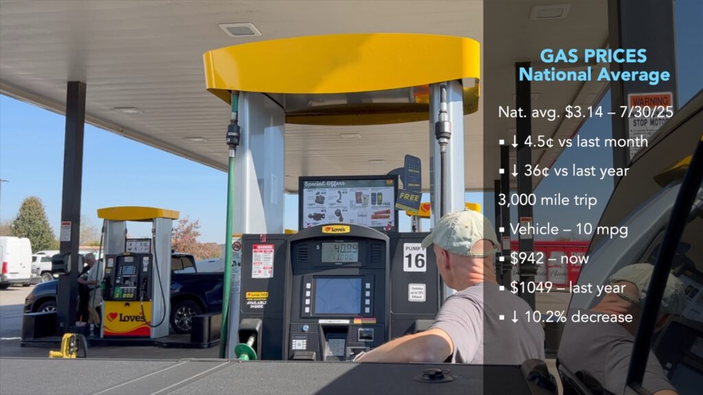 Gas prices have generally declined in the past month. According to AAA, the current average nationwide price as of July 30th was $3.14 per gallon for regular unleaded, down 4.5 cents from a month ago and down about 36 cents from a year ago. An RV trip of 3,000 miles at 10 mpg would cost $942 now vs. $1,049 a year ago, a 10.2% decrease.