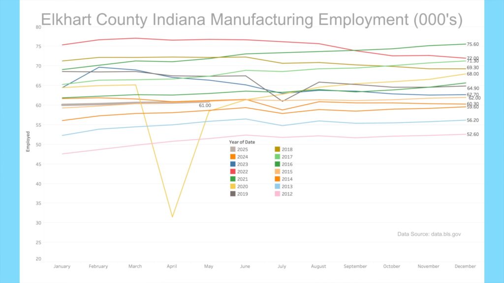 The Bureau of Labor Statistics published revised May 2025 manufacturing employment numbers for Elkhart County, Indiana. The current manufacturing employment level was 61,000, equal to the May 2015 level but significantly below that of 2016 and later years. The BLS is forecasting that manufacturing employment will decline slightly in June 2025.