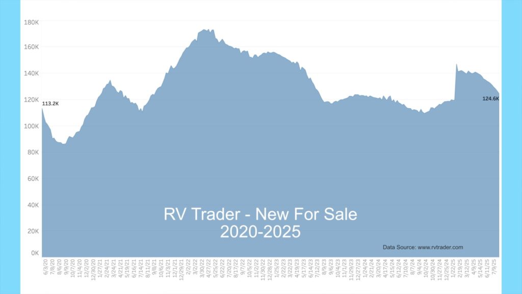 RVs for sale on RVTrader.com have decreased again since last month, with 124,598 new RVs listed as of July 30, 2025. This is down from 132,277, or 7,679 units, or 5.8% from a month ago, and up 11,488, or 10.1% from a year ago.