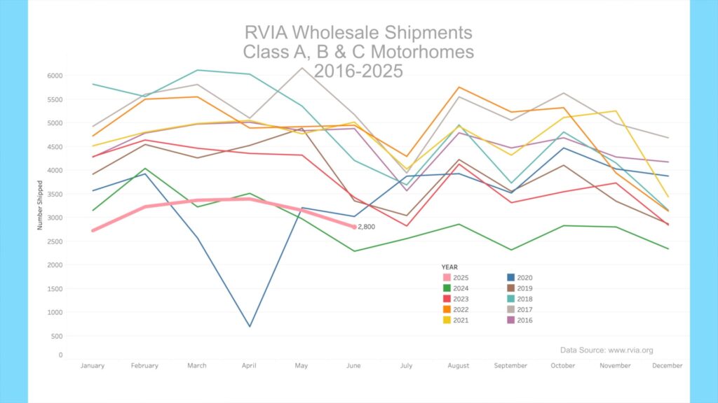 Motorhome shipments, which include Class A, B, and C motorhomes, were higher than in June 2024, with 2,800 units shipped, an increase of just over 500 units or 22.4% year-over-year. While beating June 2024, Motorhome shipments were still the second lowest on record, going back to 2016. As seen in the chart, the motorhome segment has experienced a significant slowdown in recent years.