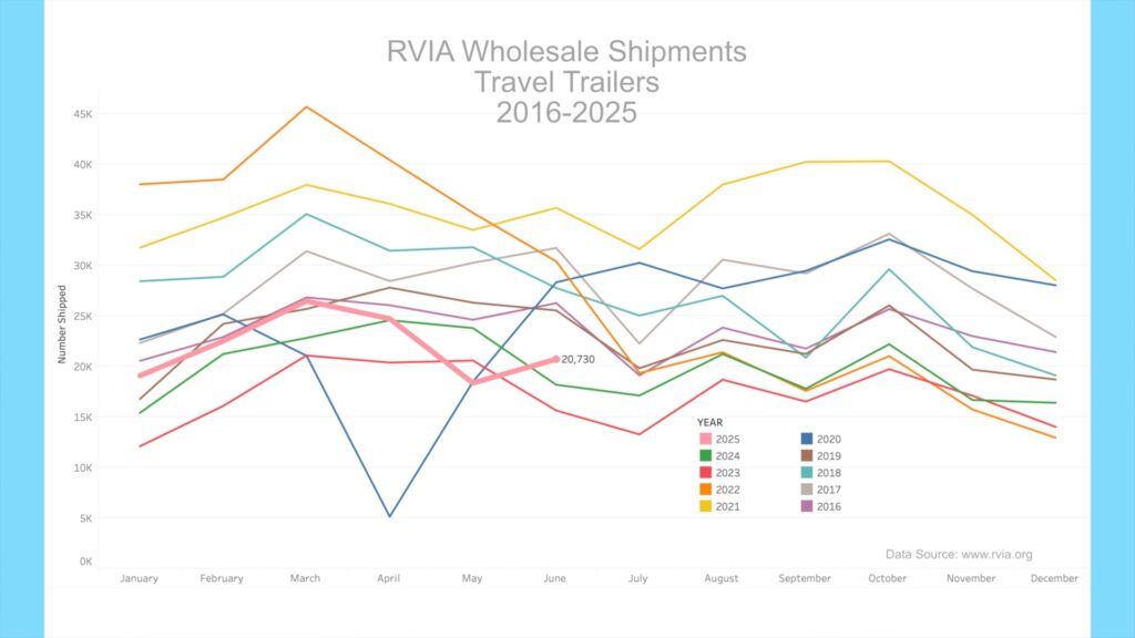 In this blog, we’ll cover the latest RV and travel data news. June 2025 RV production numbers are out, and we’ll cover the latest travel data so you can better gauge if it’s time to buy, sell, or hold an RV. Later in the news, we’ll do a general RV news round-up, including results from a large industry player.